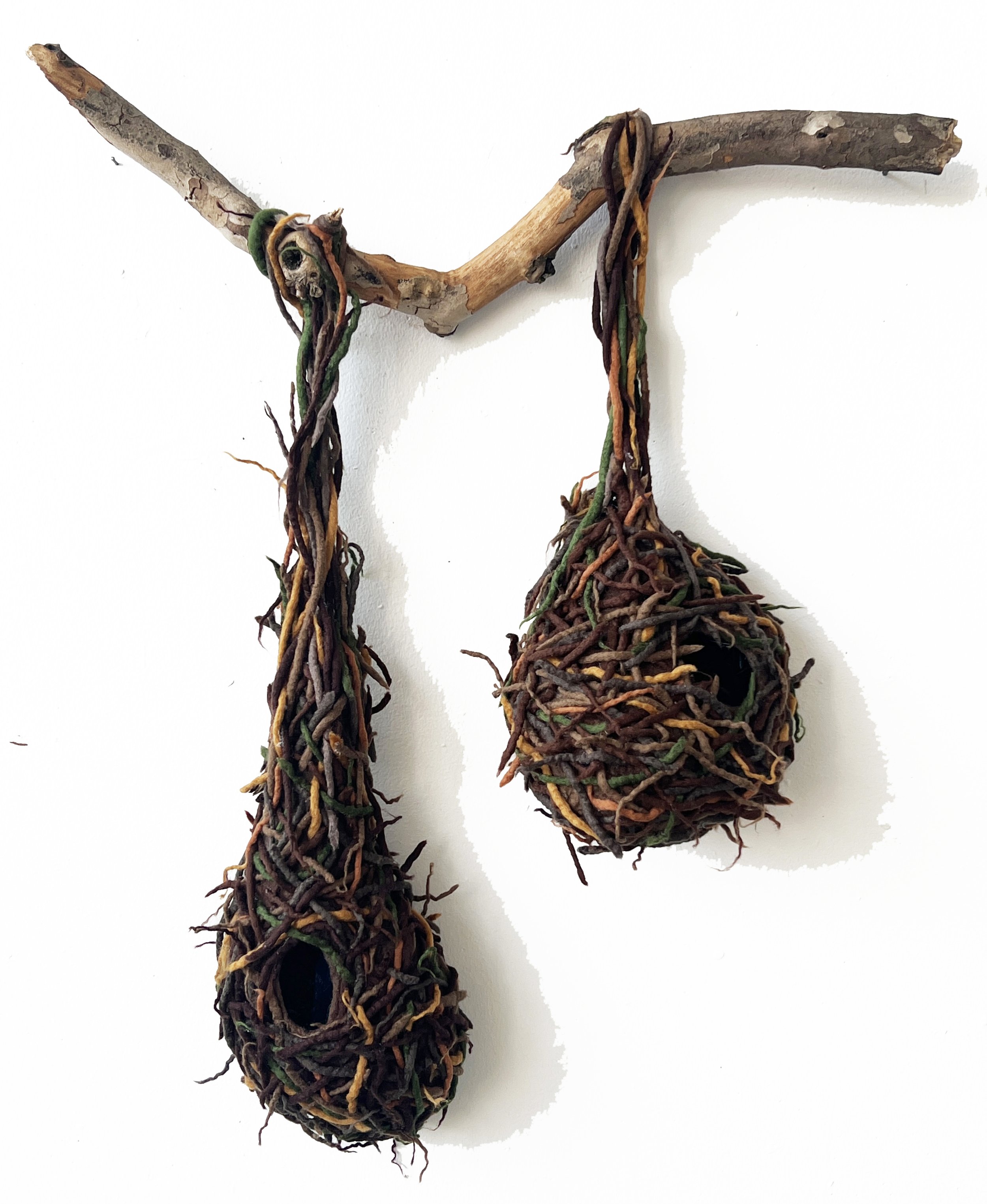 "Paper Wasp Nest" 2025, wool roving, tree branch (46 x 27 x 6")