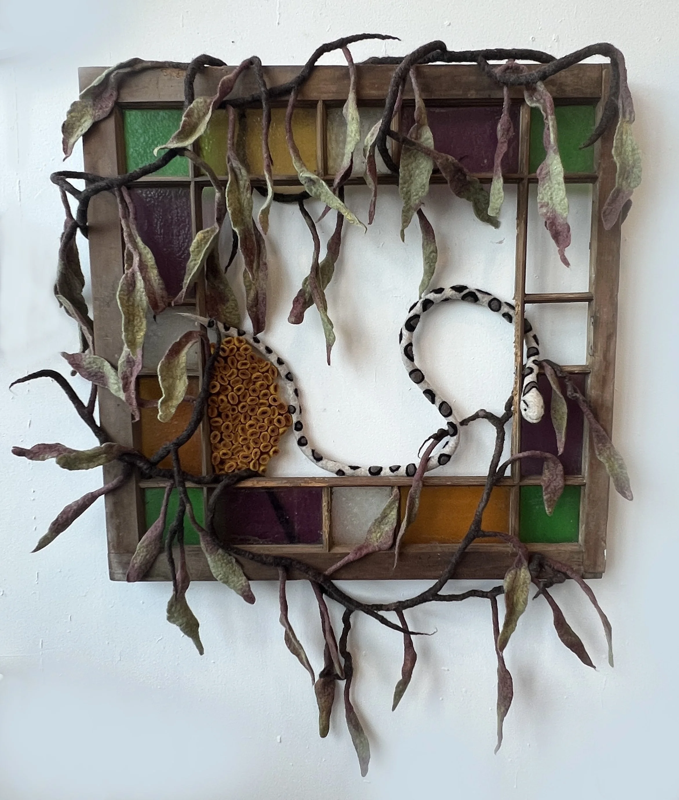 "So You Want to Restore a Cabin in the Woods" 2025, wool roving, salvaged window (35 x 44 x 6")